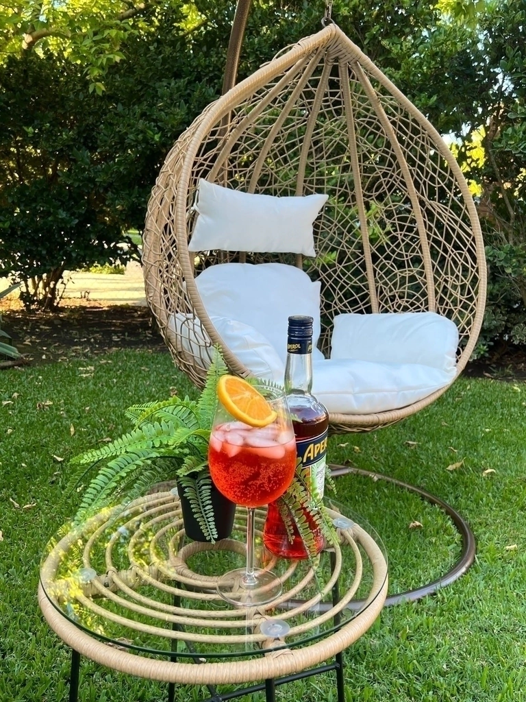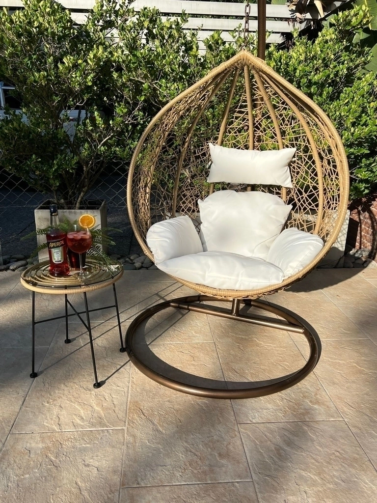 Material: Almohadones de tela póliester. Estructura de hierro pintado a horno. Revestido de ratán sintético. Soporta hasta 110 kilos. Apto para exterior.