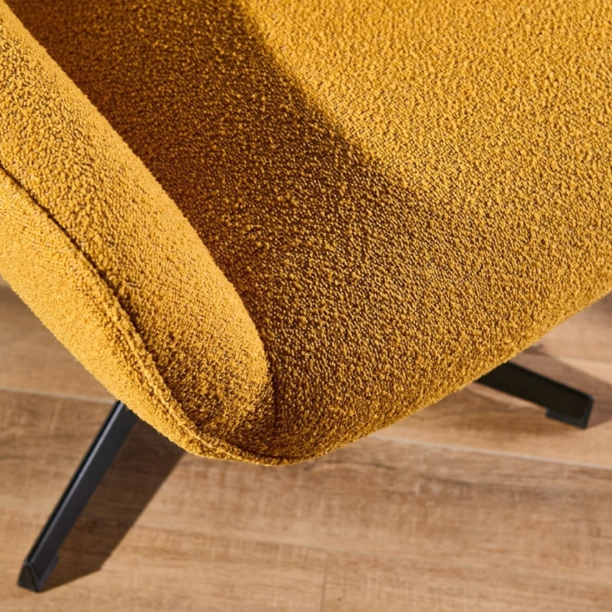 Material: Tapizado en tela bouclé. Base de hierro negro. Giratorio 360. Respaldo reclinable.