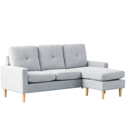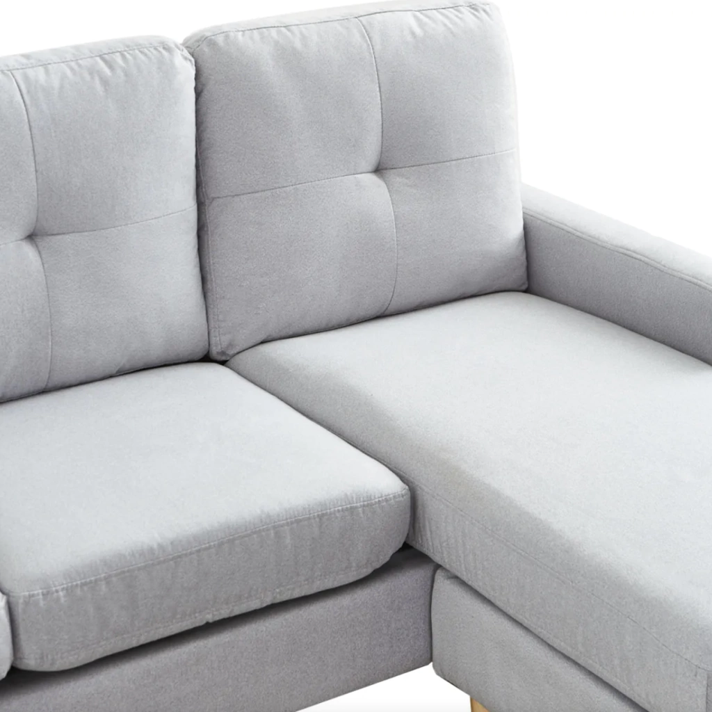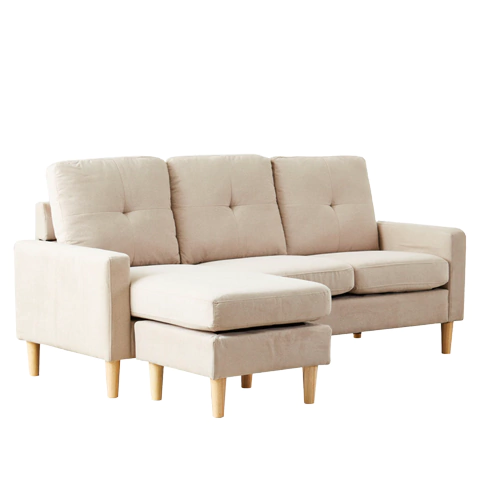 Material: Tapizado en lino anti manchas. Patas de madera haya lustre natural. Puff adaptable a 3 posiciones: esquinero izquierdo, esquinero derecho o independiente. Almohadones del asiento intercambiables a gusto según la colocación del puff. Estructura reforzada. Super funcional.